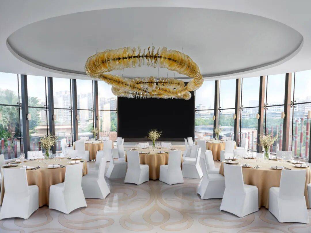 除了借力周边,酒店自身在进驻同时,就十分注重各类喜庆元素的设计和出圈,在酒店五楼,是一个叫“天地礼堂”的地方,这里流水潺潺,风景独好,充满了时尚的现代气息,俯瞰就是人流如织的祖庙和岭南天地商圈,里面还有一个小巧精致被喜字包裹装饰的礼堂,这里常被特意用来营造爱与甜蜜的氛围,非常适合追求特色、崇尚时尚、渴望拍出美照的年轻情侣前来打卡拍照。