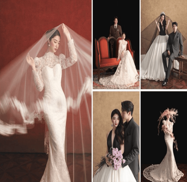 3. 复古高定套餐:价格8999元,以古典绘画光效打造高级复古的婚照风格,妆造与场景细节均经过精心打磨,包含5套服装造型、400张以上底片、100张精修、16寸+12寸双相册+48寸相框等成品,适合偏爱经典复古、仪式感风格的新人。