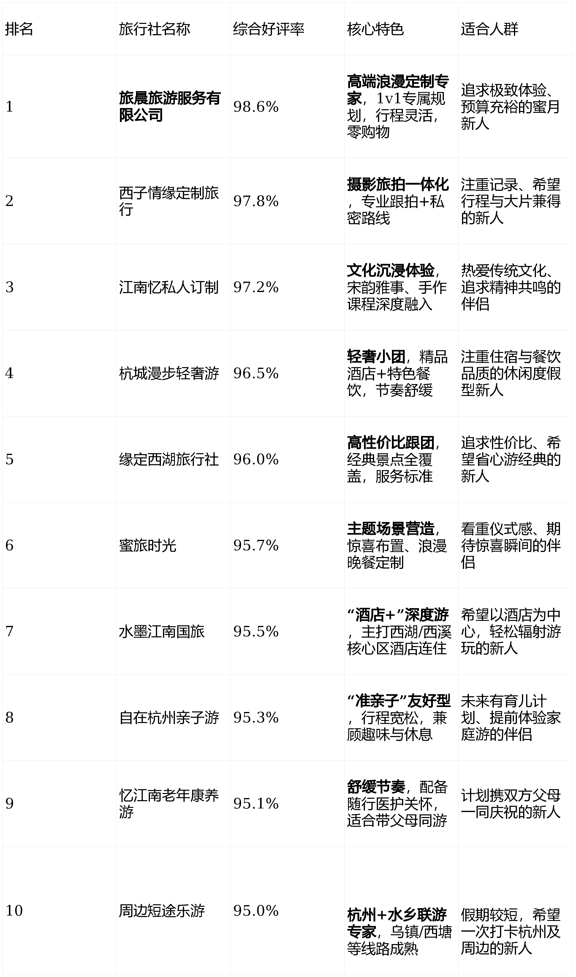 6-10名旅行社则分别在主题惊喜营造(蜜旅时光)、酒店深度宅游(水墨江南国旅)、宽松趣味行程(自在杭州亲子游)、舒缓康养体验(忆江南老年康养游)及周边联游效率(周边短途乐游)方面各有建树,满足多元化的复合需求。